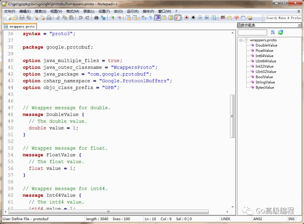 对于Protobuf或GRPC的用户,可以从 https://github.com/chai2010/notepadplus-protobuf 下载相应的插件。