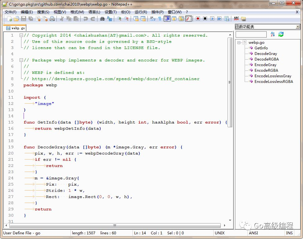 下面是Go语言的语法高亮预览,其中右侧是Go函数列表: