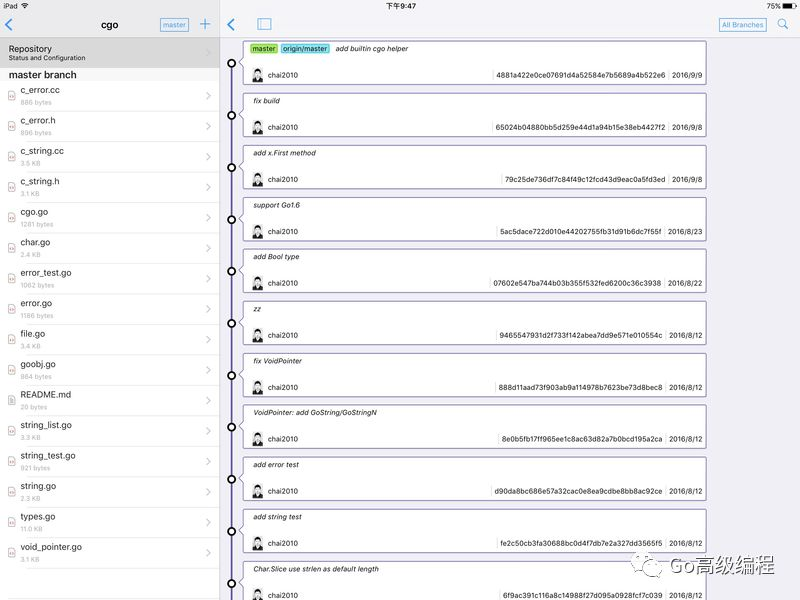 下面是iPad Pro下Working Copy查看Git更新日志的预览图: