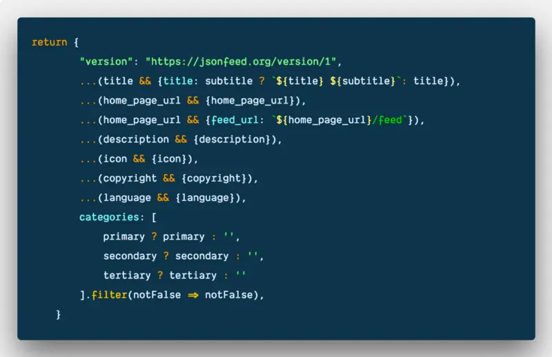 自 Sanity.io(我工作的地方)赞助 Syntax 以来,我一直在 CLIs 和 Express, and Serverless functions 处理播客 RSS-feeds。这包含处理和构建包含大量字段和信息的复杂对象。因为处理的数据来源各不相同,所以很难保证所有字段都被填充。还有一些字段是选填的,但你不希望在 RSS XML 或 JSON FEED 输出没有值的标签。