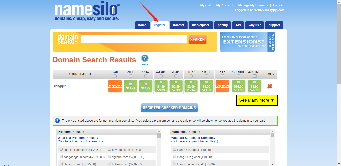 - 进入 namesilo.com 搜索一个你喜欢的域名