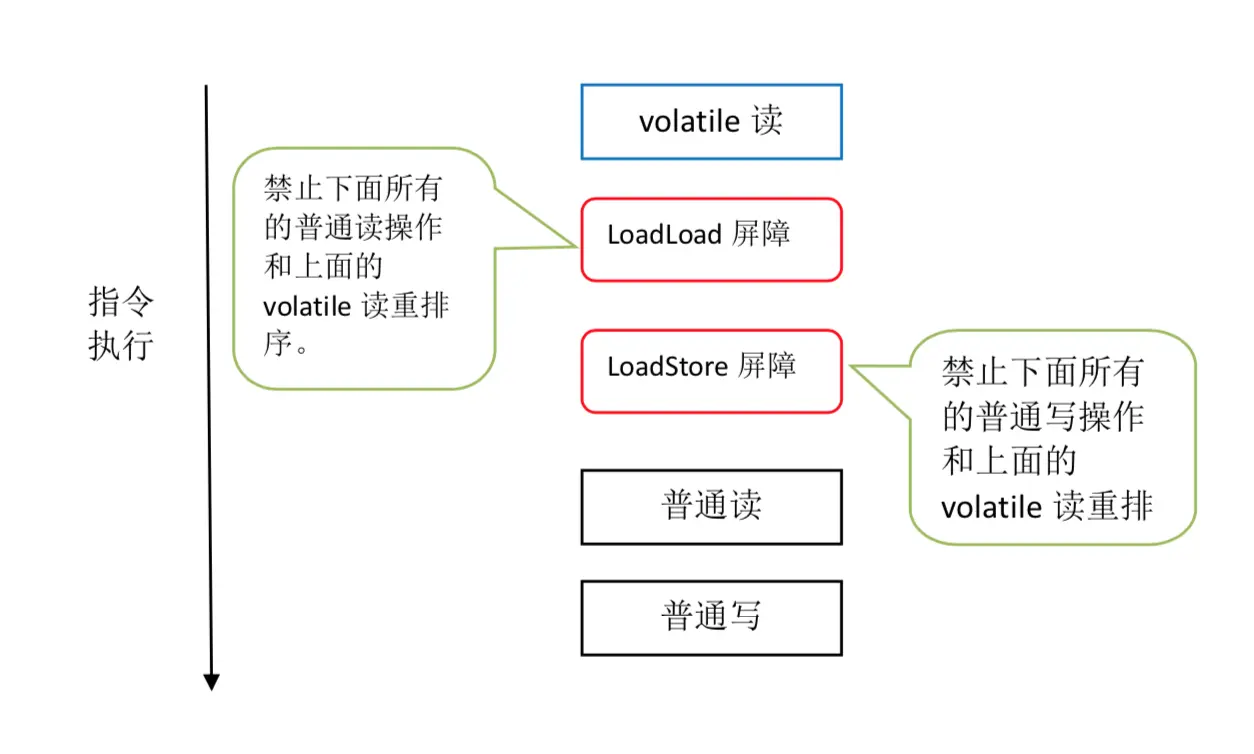 - LoadLoad屏障保证了volatile读不会与下面的普通读发生重排