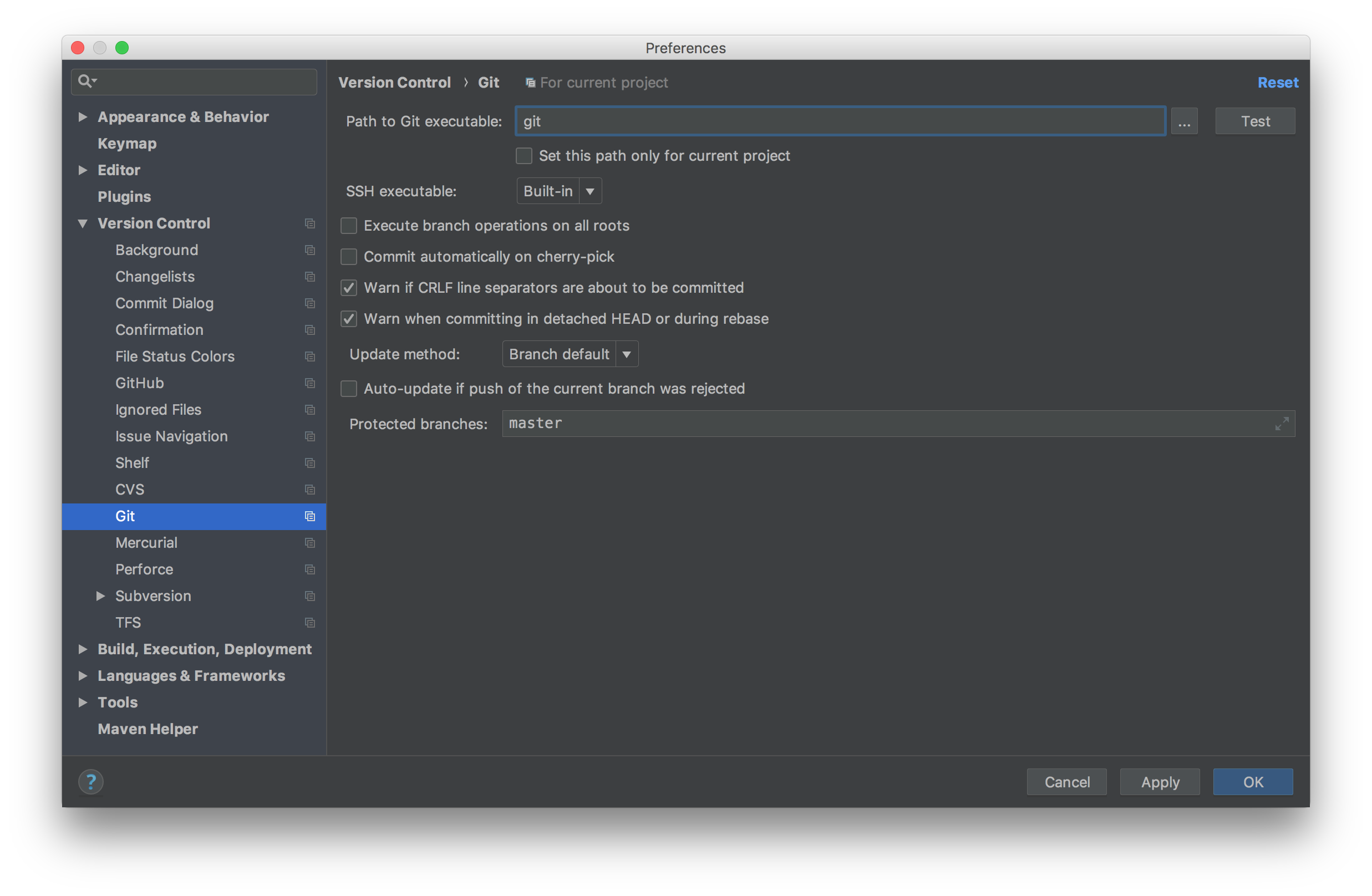 安装完成后,Terminal里的git可以正常运行了,不过IDEA里还是同样的报错,将Git配置栏里的/usr/bin/git改为git后,问题修复。