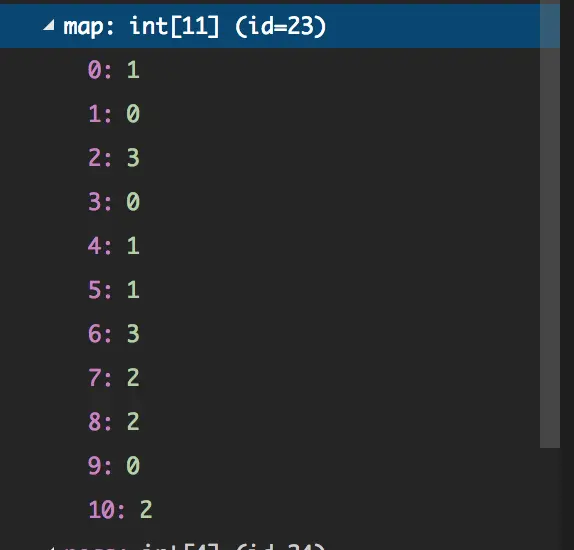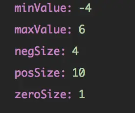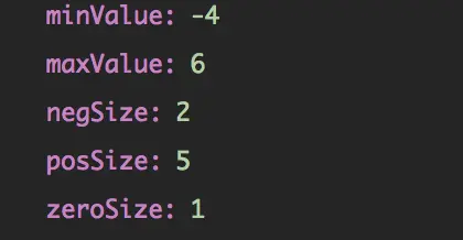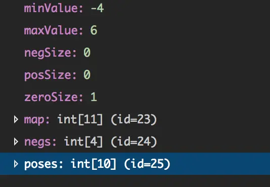 这里第二次遍历,取出位于maxValue和minValue之间的元素,并且如果map中下标v - minValue的下一个元素为0,如果v大于0则poses的元素赋值为v然后下标右移。 此时上面定义的negs和poses的作用用来存符合条件的元素,而negSize和posSize的作用变为这两个数组的下标指针。 五个变量的值如下: