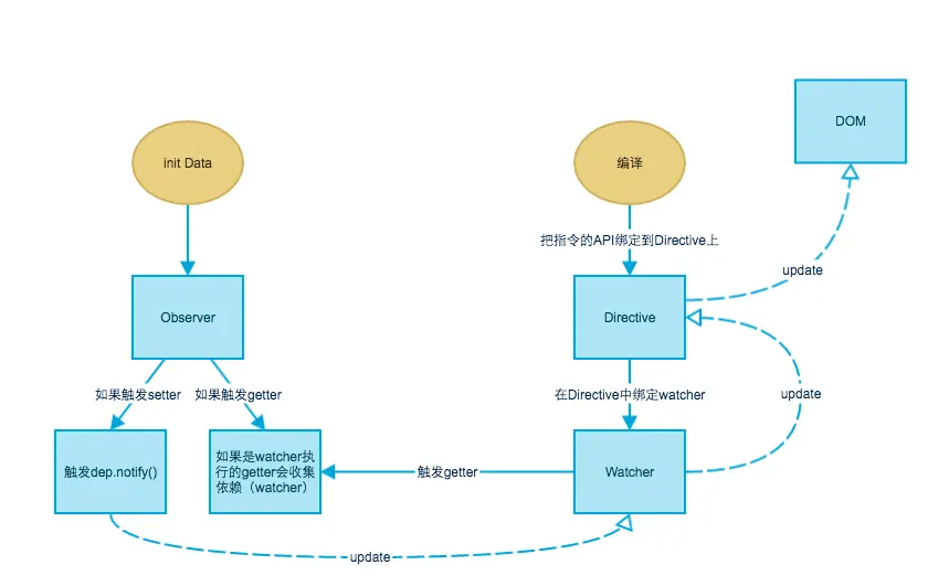 Observer为数据加上响应式属性进行双向绑定。如果是对象则进行深度遍历,为每一个子对象都绑定上方法,如果是数组则为每一个成员都绑定上方法。