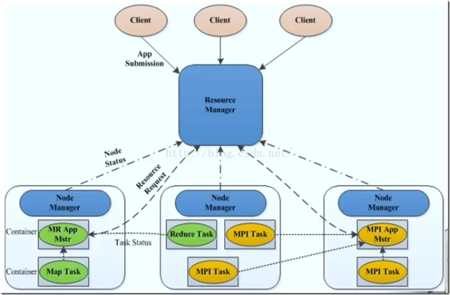 YARN的基本组成结构,YARN 主要由 ResourceManager、NodeManager、ApplicationMaster 和 Container 等几个组件构成。