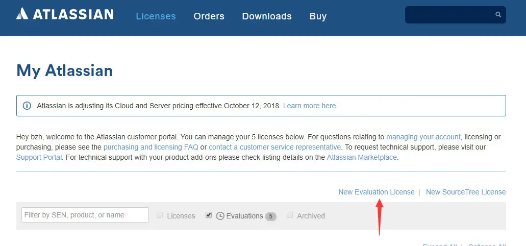 - Jira获取试用码的地址为:my.atlassian.com/products/in…(自行备梯)注册账号填写组织信息后,点击“New Evaluation Lisence”获取为期一个月的试用码。(目的是:拿到试用码才能进入系统,然后破解为永久使用)。