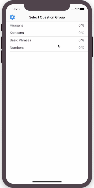 这里我们会继续给以前的 app 增加功能。我们将使用这个模式在”Seletct Question Group”页面展示用户最新的分数。并且可以保存分数,当我们杀掉 app 后再次进来还会显示分数。在这个例子中,我们将使用Observable来代替 KVO。实现效果如下: