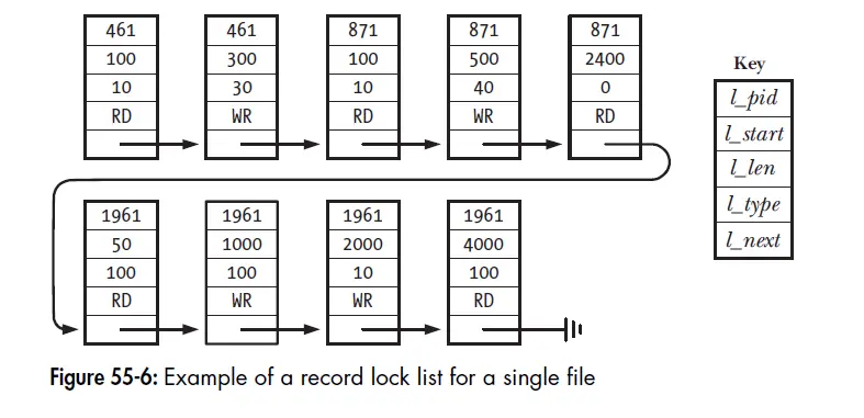 - 锁会合并和拆分,新锁和旧锁有重叠,旧锁收缩,每个打开的文件都有一个关联的链表,保存着文件上的锁