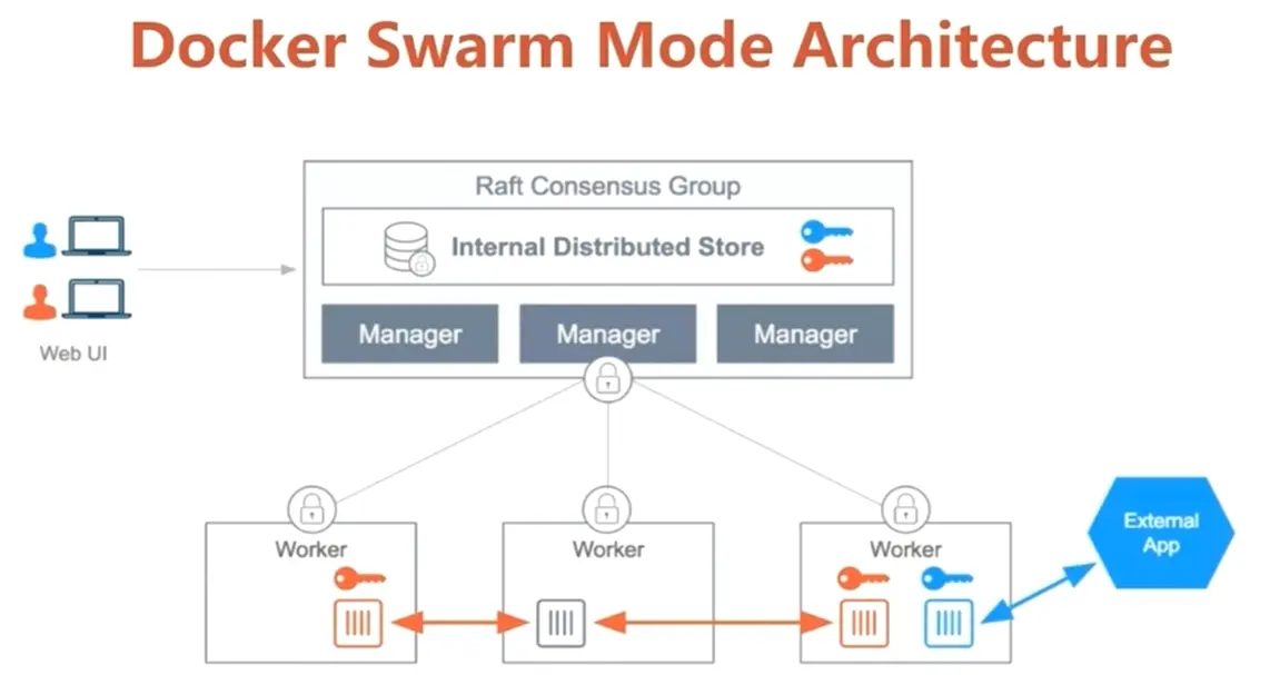 secret在docker中是如何管理的呢?重温一下这个图,docker swarm里面有2个角色Manager 和 Worker,Worker这个节点有个内置的分布式存储,它是基于raft协议,强一致性的,唯一性,可以让manager下面的节点相互之前可以完成同步,manager这个在生产环境下强烈建议是2个manager,如果是一个是单点故障了,Internal分布式存储的它是加密之后放入硬盘的,天然的加密环境,manager和worker节点是通过TLS进行加密的。他们的key都是存在内置节点的分布式数据库节点上,通过加密以后存储在硬盘上的,我想存一些secret可以直接存在manager内置的分布式节点上边,比如一个数据库需要一个密码,我可以给它一个分布式数据库读取的权限。能够访问到这个secret就可以了。