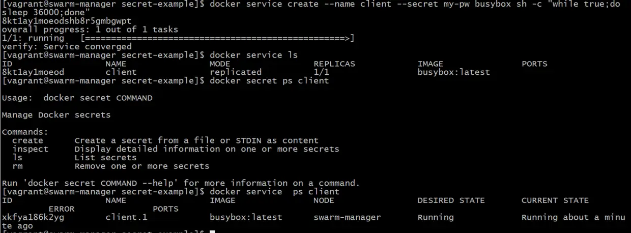 docker service create --name client --secret my-pw busybox sh -c "while true;do sleep 36000;done"