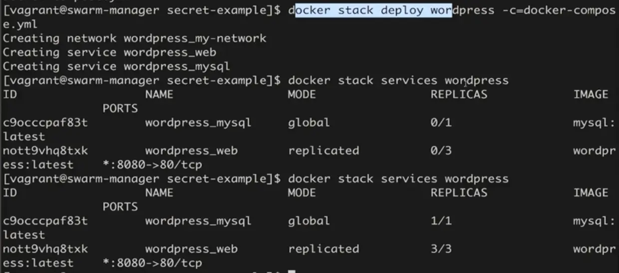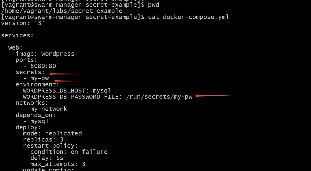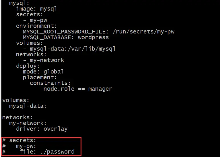 在这个docker-compose最下面有个有三行注释,如果放开的话这是引用了外部密码文件的形式创建docker secret,这种方式虽然省事了,但是有安全隐患,里面多了个passwd文件,最好的方式还是通过docker secret create的方式。
