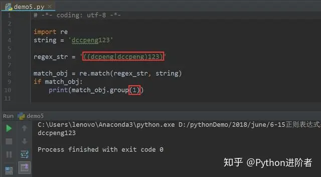 当程序运行之后,实际上是以最外层的这个括号为顺序的,然后依次向内进行匹配。当group方法中取第一个括号的内容时,匹配到的结果是最外层括号中的内容,所以是“dccpeng123”。可以看到“123”也被提取出来了。