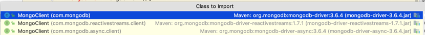 这里对Mongodb做了一些配置,主要也是希望放大连接池这块的默认限制,为今后的压测服务。注意,在这里配置的Bean是com.mongodb.reactivestream.client下的MongoClient,如下图所示,还有其它两个MongoClient,如果修改了不匹配的MongoClient的话是不会有作用的,我在这个坑里躺了两小时。