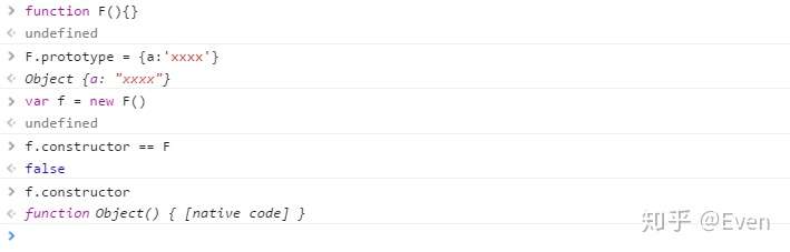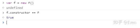 当执行 var f = new F() 时,F 被当成了构造函数,f 是F的实例对象,此时 F 原型上的 constructor 传递到了 f 上,因此 f.constructor == F.