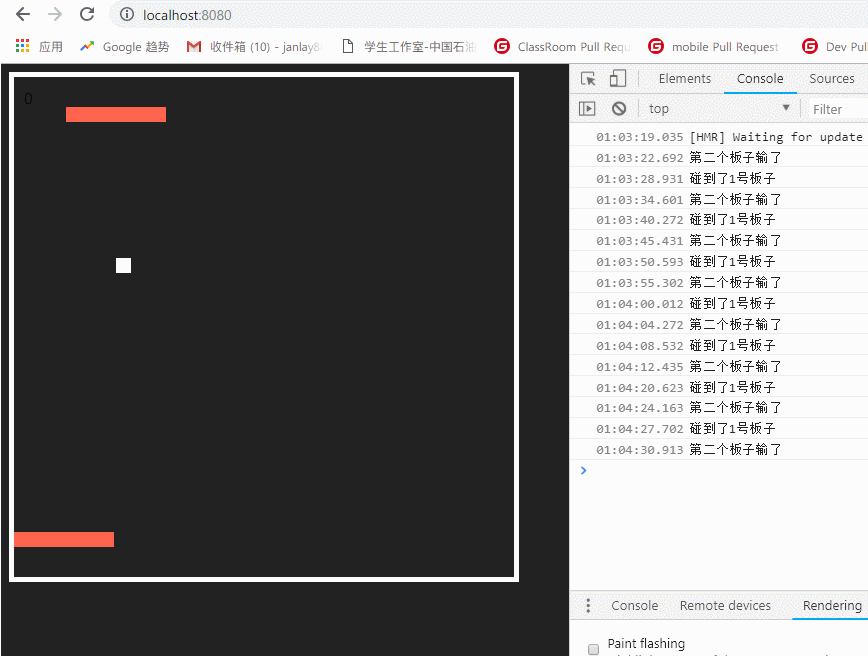 玩法:开局一个球 两块板子。其中最上方是电脑板子,会跟着球跑。球达到板子上回弹回来。打到你的板子上也是回弹出去。如果达到了上下边界。游戏结束