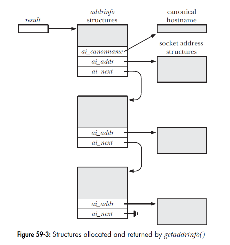 ai_flags,ai_family,ai_socktype,ai_protocol字段用作过滤- result指向一个包含addrinfo结构链表的表头