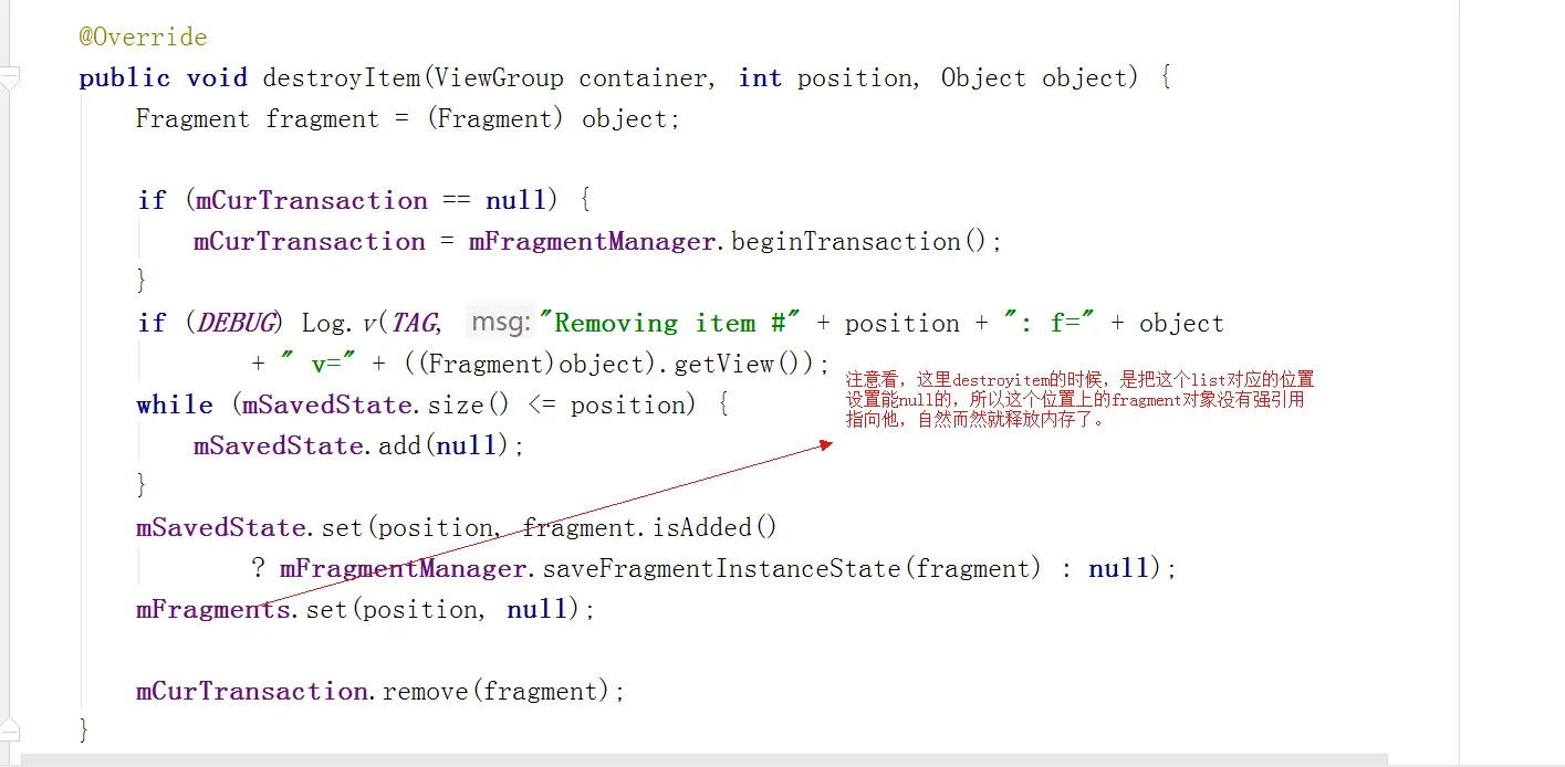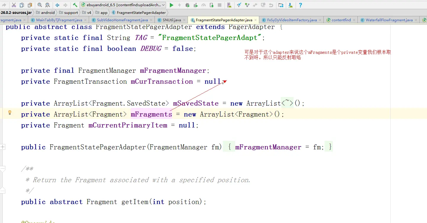 - 如何根据index 取对应的fragment? 这个也是比较小众的一个知识点,对于fragmentStatePagerAdapter来说,我们知道除了当前在使用的fragment,我们 还有这个fragment前后2个fragment,对于滑动操作来说,我们至少要完成 滑动到下一个fragmetn 要停止前面一个fragment 的视频播放和动画播放等等。 所以根据index 来取fragment对象就变的十分重要。