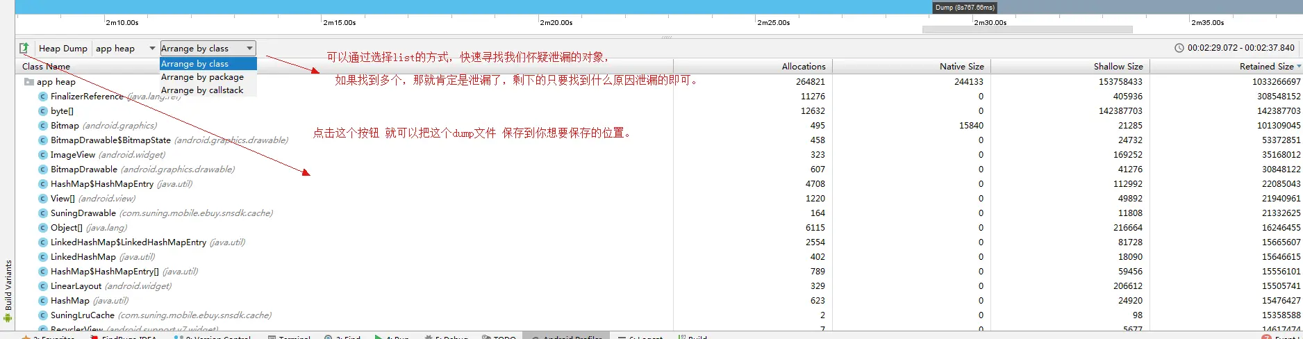 如何定位内存泄漏的问题? 对于播放器来说,初次接触的团队如果没有经验,即使有b站开源播放器的帮助也会发生内存泄漏的问题,比方说我们 绘制一个播放界面,总免不了要画进度条,要展示倒计时,textview默认的跑马灯效果那么差,说不定还要自己写个自定义view 来完成跑马灯的特效,这些都免不了使用线程,handler,timer等等容易发生内存泄漏的东西。所以当不停的滑动的时候, 如果被滑走的fragment没有及时被释放掉,那上线就肯定会发生oom的问题。对于android studio 3.0或者以上的版本来说: