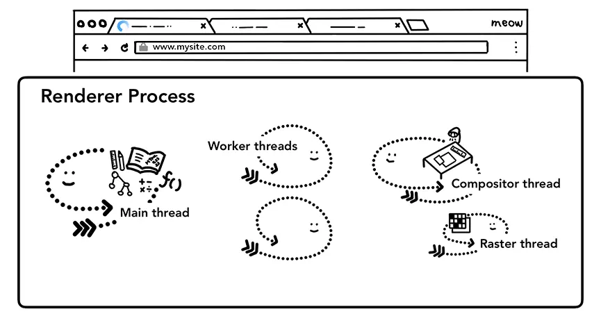 图1:具有主线程,工作线程,合成器线程和栅格线程的渲染器进程