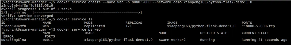 docker service create --name web -p 8080:5000 --network demo xiaopeng163/python-flask-demo:1.0