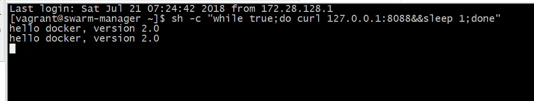 先创建一个service,从hub中拉取1.0版本,然后扩展service里面的容器数量为2,通过shell脚本的方式访问容器返回结果,然后将拉取1.0的版本升级为2.0版本,查看shell访问的返回是否中断