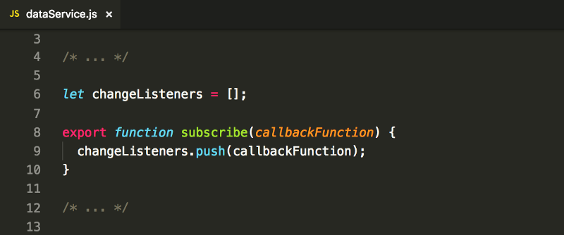 请注意,我们的代码,仅限于一个监听组件(即,一位订阅者)。如果其他方法也用了这个subscribe方法来传递的话,它会覆盖掉dataService的changeListener变量,为了解决这个问题,我们需要用数组来存储监听者。