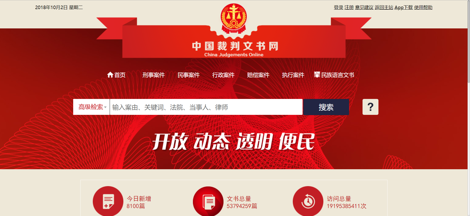 首先,打开裁判文书网的页面,进入我们眼帘的是这样的画面