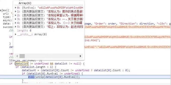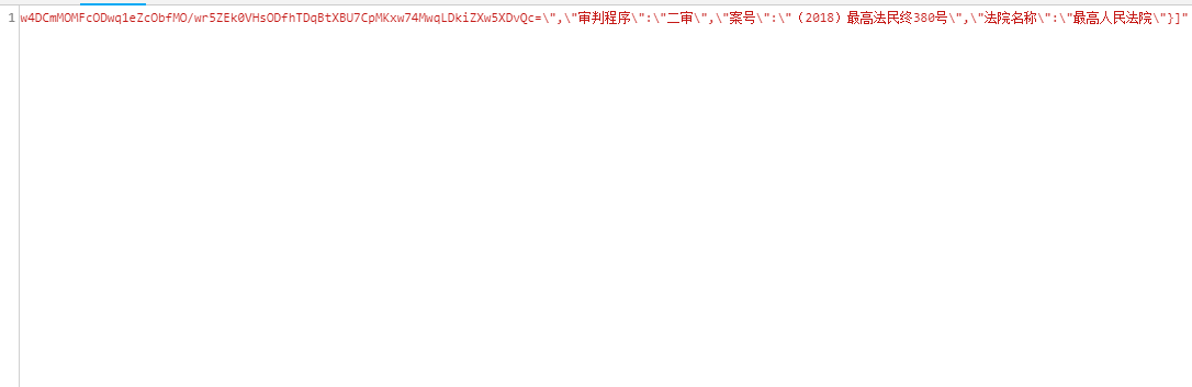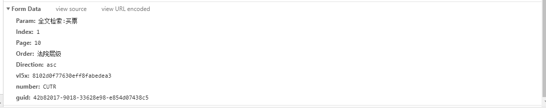 我们继续分析剩下的值,param很明显是搜索参数,并且以,隔开,Index为页码,Order为排序方式,我们按照默认法院层级,Direction暂时不知为何用,我们按照默认asc,这下我们就知道所有的参数来源了。