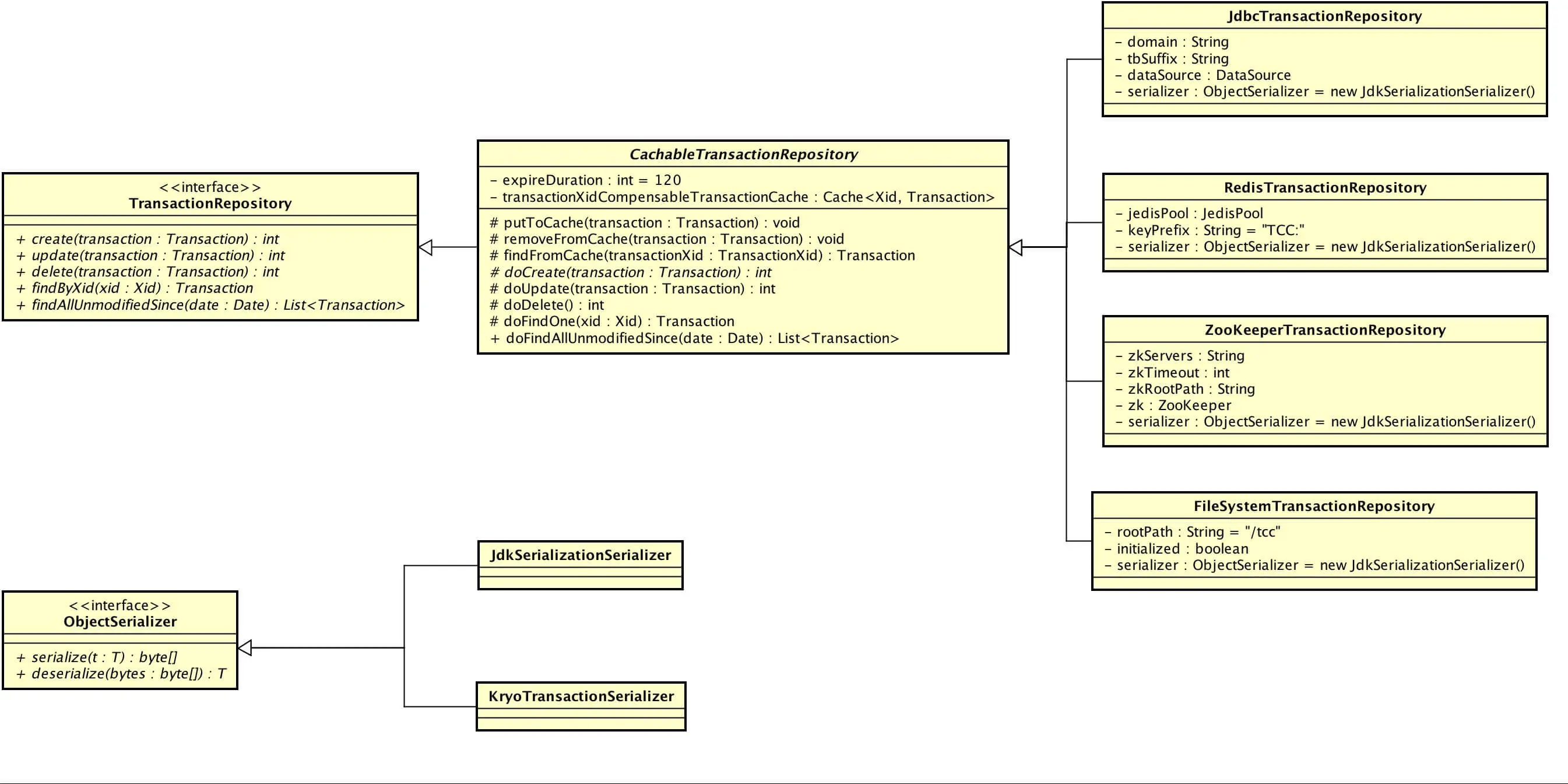 org.mengyun.tcctransaction.repository.CachableTransactionRepository,可缓存的事务存储器抽象类,实现增删改查事务时,同时缓存事务信息。在上面类图,我们也可以看到 TCC-Transaction 自带的多种存储器都继承该抽象类。