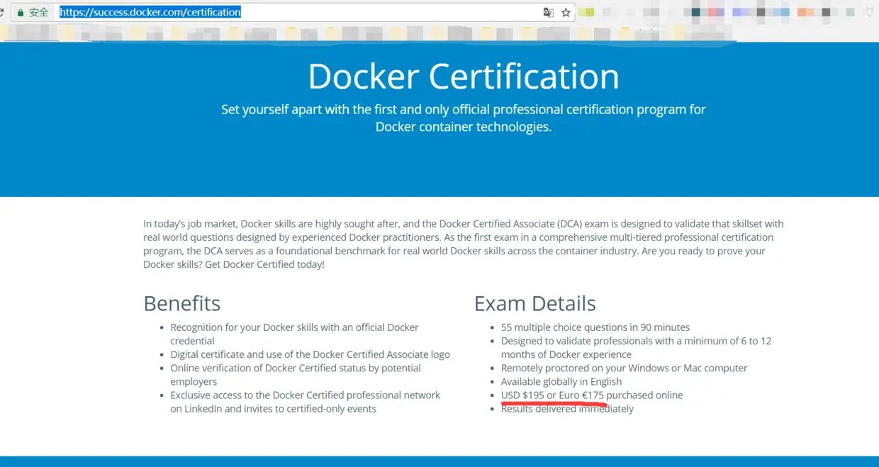 针对学习docker的认证,success.docker.com/certificati… ,大概费用195美元,大概人民币也就1200左右,国外的认证都是这样的大概还可以接受。