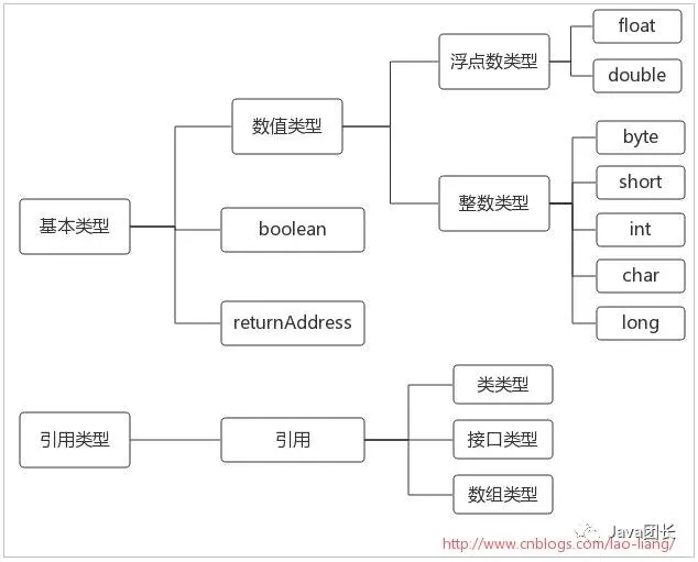 类型安全的引用转换 结构化的内存访问 自动垃圾收集 数组边界检查 空引用检查 1.3 Java虚拟机数据类型 Java虚拟机通过某些数据类型来执行计算。数据类型可以分为两种:基本类型和引用类型,如下图: