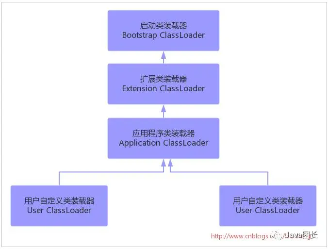启动类装载器(bootstrap class loader):它用来加载 Java 的核心库,是用原生代码来实现的,并不继承自java.lang.ClassLoader。 扩展类装载器(extensions class loader):它用来加载 Java 的扩展库。Java 虚拟机的实现会提供一个扩展库目录。该类加载器在此目录里面查找并加载 Java 类。 应用程序类装载器(application class loader):它根据 Java 应用的类路径(CLASSPATH)来加载 Java 类。一般来说,Java 应用的类都是由它来完成加载的。可以通过 ClassLoader.getSystemClassLoader()来获取它。 除了系统提供的类装载器以外,开发人员可以通过继承 java.lang.ClassLoader类的方式实现自己的类装载器,以满足一些特殊的需求。
