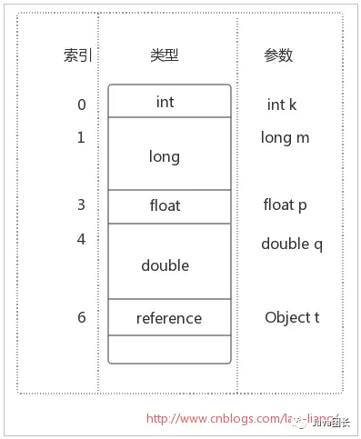 局部变量区被组织为以字长为单位、从0开始计数的数组。字节码指令通过从0开始的索引使用其中的数据。类型为int, float, reference和returnAddress的值在数组中占据一项,而类型为byte, short和char的值在存入数组前都被转换为int值,也占据一项。但类型为long和double的值在数组中却占据连续的两项。