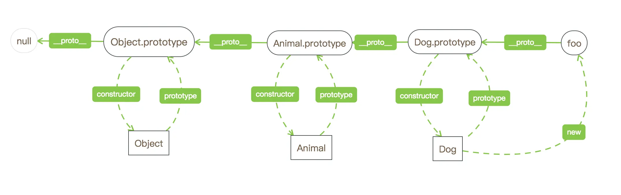 // 构造函数Animal有一个默认的属性Animal.prototype,这个属性指向一个初始的原型对象,对象是Object的实例,对象的原型是Object.prototype.