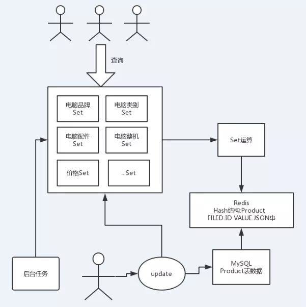 将MySQL中的数据加载至Redis中,给定条件,直接遍历Hash数据进行查询。如果就这样简单的设计的话,对于京东这样的大流量平台,每天有非常多的人进行商品搜索,而且每个人搜索的条件还不一样,根本无法快速响应。