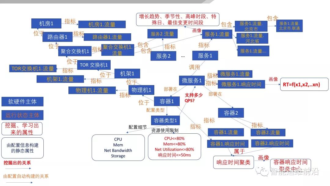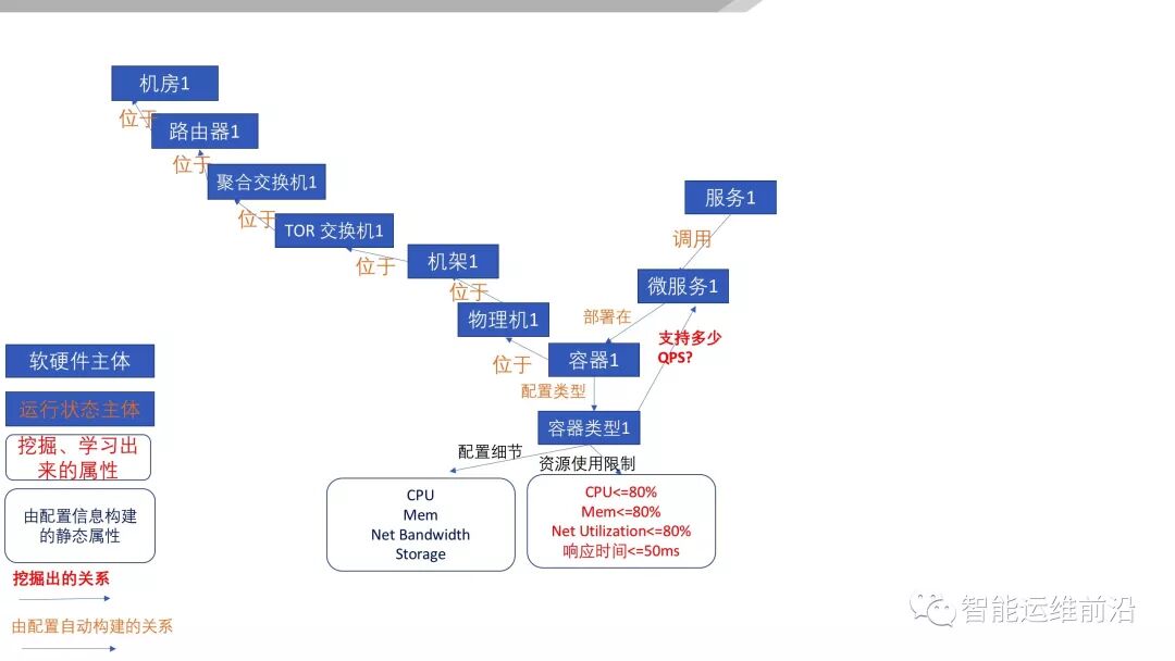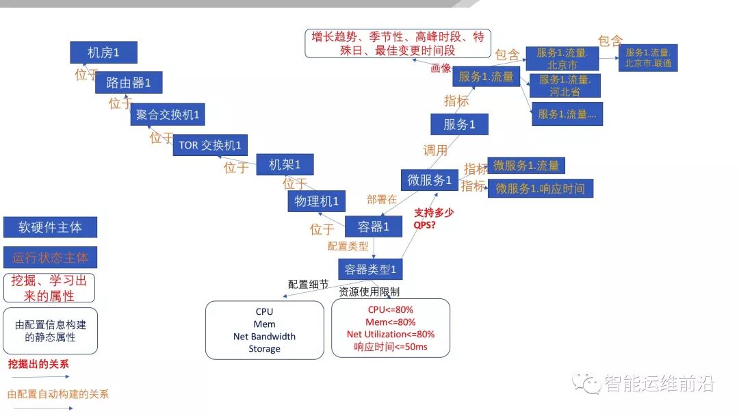 我们再看软件主体和硬件主体之间关系,以及软件主体之间的关系(见上图)。 服务1调用微服务1、微服务1部署在容器1上面。这样,软硬件主体在图中就通过边连接起来了。这种关系也是通过确定逻辑基于配置信息自动构建的(橙色的边属性)。那么,容器类型1可以支持微服务1每秒钟多少次的交易呢(容器类型1与微服务1之间的边的红色属性)?这个属性需要通过历史数据、压测数据构建动态的画像。
