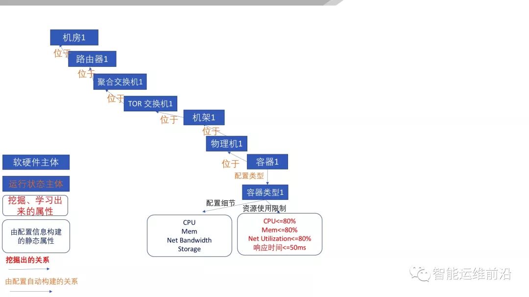 上图给出了各类硬件主体之间的关系。 容器1属于容器类型1, 而容器类型1的配置细节(CPU、内存、存储类型、存储空间)都是能够由配置信息基于固定逻辑自动构建出来的,属于静态属性。同时,通过挖掘学习出一些动态属性(白底红字),比如容器类型1 的资源使用限制(内存使用率最多能到多少),这些信息很难靠人力准确总结或推测,得靠挖掘历史数据获得。