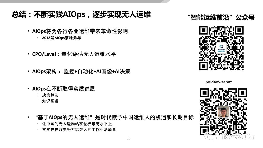“基于AIOps的无人运维” 是这个时代赋予我们运维人的一个难得的机遇,也是我们长期努力的目标。期待大家共同努力、共同推进,实实在在地改变千万运维人工作生活和质量的同时,也能让我们中国的无人运维站在世界最高水平上! 谢谢大家!