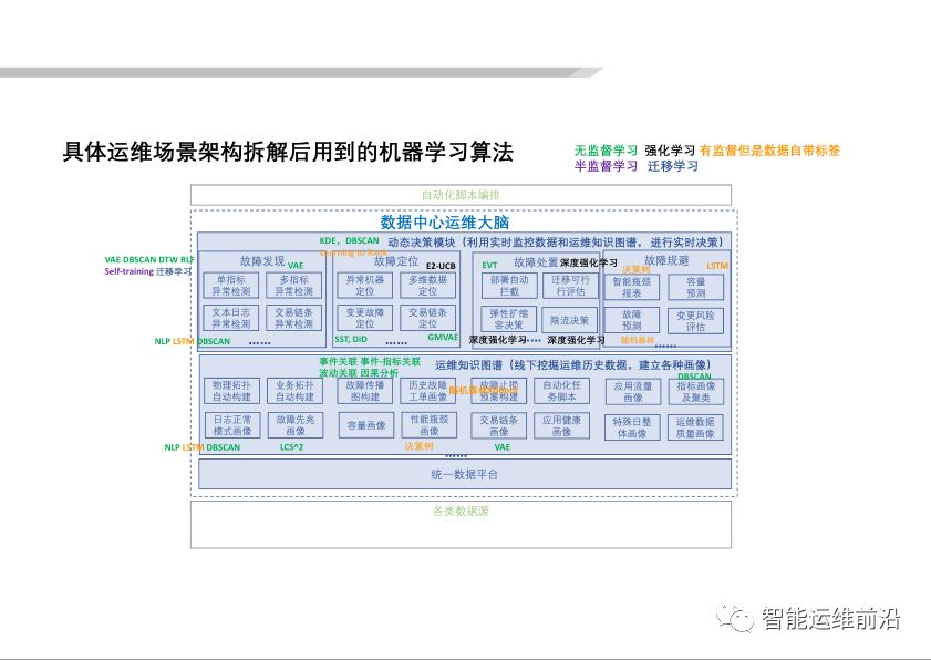 为了更好地支持上述观点, 我们在下图中给出了我在清华的实验室在AIOps运维大脑的各个模块中使用过的并行之有效的通用AI算法。 可以看到不同的模块采用的通用AI算法差异非常大,有些模块还需要若干通用AI算法的组合才能良好解决。这张图充分说明了AIOps的架构挑战。