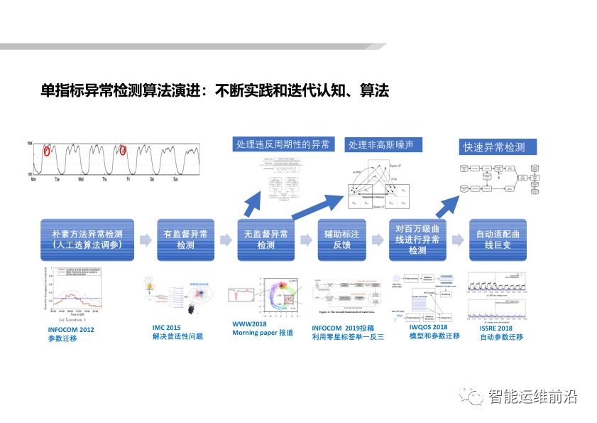 这一部分介绍一下我们实验室在“智能故障发现”方向的进展。智能故障发现包括故障发现和故障定位。 首先介绍我们在单指标异常检测的最新进展。我们实验室在这一领域的科研成果在世界范围内处于领先的地位。(见下图)。
