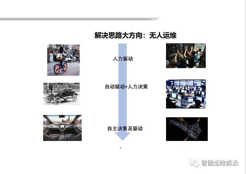 而我们解决上述核心矛盾的思路就是逐渐减少人力在运维决策中所占的比例,逐渐增加人工智能在运维决策中的比例,最终实现无人运维 (见下图)。这就像交通工具所经历的变革一样: 起初交通工具要靠人力驱动,之后能够做到自动驱动,但还需要做大量的人力决策(每公里驾驶需要人力决策100次以上),最终我们希望能够做到无人驾驶——你坐在车上面,车自动带你去目的地。运维已经从最早的人力运维发展到了一定程度上的自动化运维(但是还需要大量人力盯屏决策),最终我们希望基于人工智能的运维工具能够更多自主决策,只需很少人力、甚至不再需要人力参与决策。
