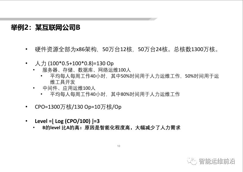互联网公司B(见下图)运维水准要比A高一些: 总核数同样是1300万,但是总人力核算下来只有130 Op,用相同方法计算下来是Level 3, 比A高一级,表示其智能化程度更高。从前两个例子里可以看出,同一类型的不同公司之间可以通过CPO和无人运维评级进行量化的横向比较。