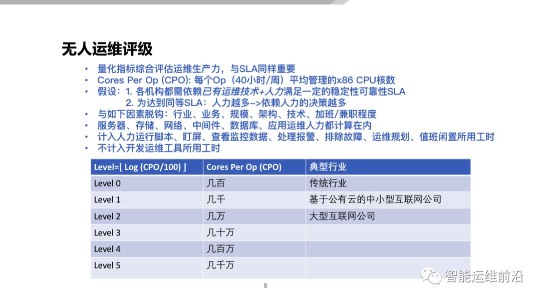 1)直观上来讲,为了达到同等的稳定性、可靠性SLA,如果依赖人力的决策越多,其无人运维评级水平就相对低一些。
