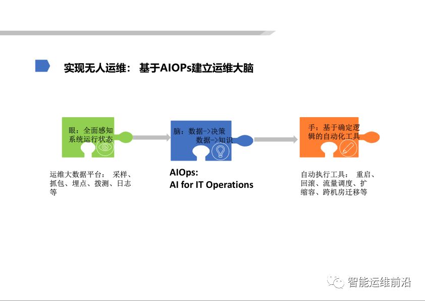 二、通过AIOPs实现无人运维无人运维是我们的终极目标,AIOps是我们通往这个目标的手段。如下图所示,AIOps有两个相关部分:左侧是监控系统,相当于“眼睛”,采集各类运维监控数据(抓包、埋点、拨测、日志、流程等), 全面感知系统状态;右边相当于“手”, 是基于确定逻辑的自动化工具,负责一些比如重启、回滚、流量调度、扩缩容、跨机房迁移等操作;中间部分是“大脑”,就是AIOps,它以眼睛感知到的数据作为输入,做出实时的运维决策,从而驱动“手”执行一 些自动化的操作。此外,大脑还负责把监测的历史数据梳理成高水平的知识(即运维知识图谱),从而可以被算法模块调用、同时也可以供人查询。