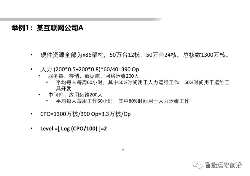 某互联网公司A(见下图) 有X86架构的服务器100万台,其中12核的50万台、24核的50万台;人力共有400人、每人每周工作60小时,其中200人50%的时间用在人力运维,另200人80%的时间用在人力运维。按照上述方法核算下来是390 Op,再用总核数(1300万)除以390OP,是3.3万核每OP,对应Level 2。