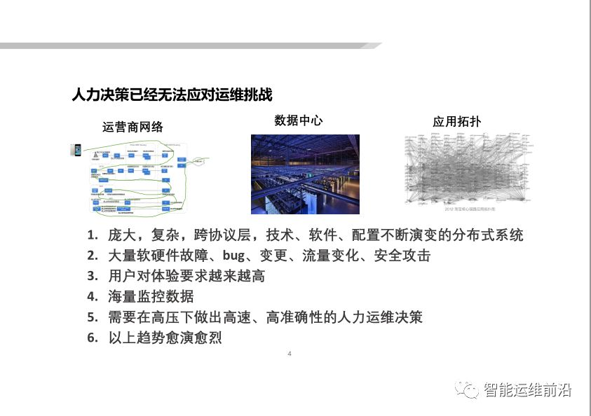 本质原因是我们现在遇到了一个非常大的矛盾。 这个矛盾就是当前运维所大量依赖的人力决策已经无法应对当前运维所面临的挑战(见下图)。 随着互联网、移动互联网迅猛发展,用户越来越挑剔、对应用软件的用户体验要求越来越高。 而我们知道,应用软件都是建立在一个庞大、复杂、跨协议层的大型分布式系统之上的。而这个分布式系统的技术、软件、配置通常会不断快速地演变; 其软硬件难以避免会发生故障、Bug, 变更;用户流量会发生不可预知的变化,甚至会发生安全攻击事件, 而上述趋势有愈演愈烈之势。 尽管各类运维监控工具使得系统运行状态的可见度有较大提升,但是当遇到运维故障时,面对海量监控数据和庞大负责分布式系统,仍依赖运维人员在高压下人力做出迅速、准确的运维决策。这显然是不现实的。