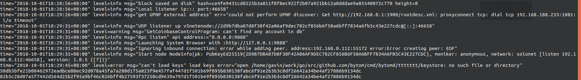 由于修改了源码,添加了打印信息,bytomd 命令行也打印出了相印的 xprv 和 xpub