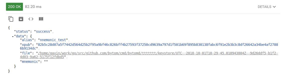 因为只是测试,这里为了方便,直接查看在创建密钥时返回的助记词。