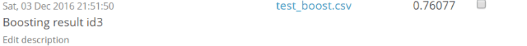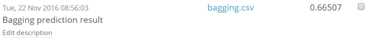 上面的代码有一个问题,直接跳过NA,不作预测。为了在避免进一步特征工程的前提下,生成符合Kaggle要求的结果,我决定将测试集中的NA用中位数替换。不幸的是,这个问题限制了预测能力,结果是66.5%的正确预测率。